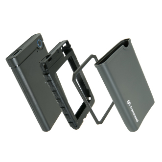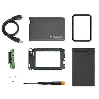 Transcend's 2.5” SSD/HDD Enclosure Kit includes a 2.5-inch enclosure with an outer rubber case, an inner rubber shock absorber, a SATA adapter, a USB cable, a 7mm to 9.5mm spacer, |